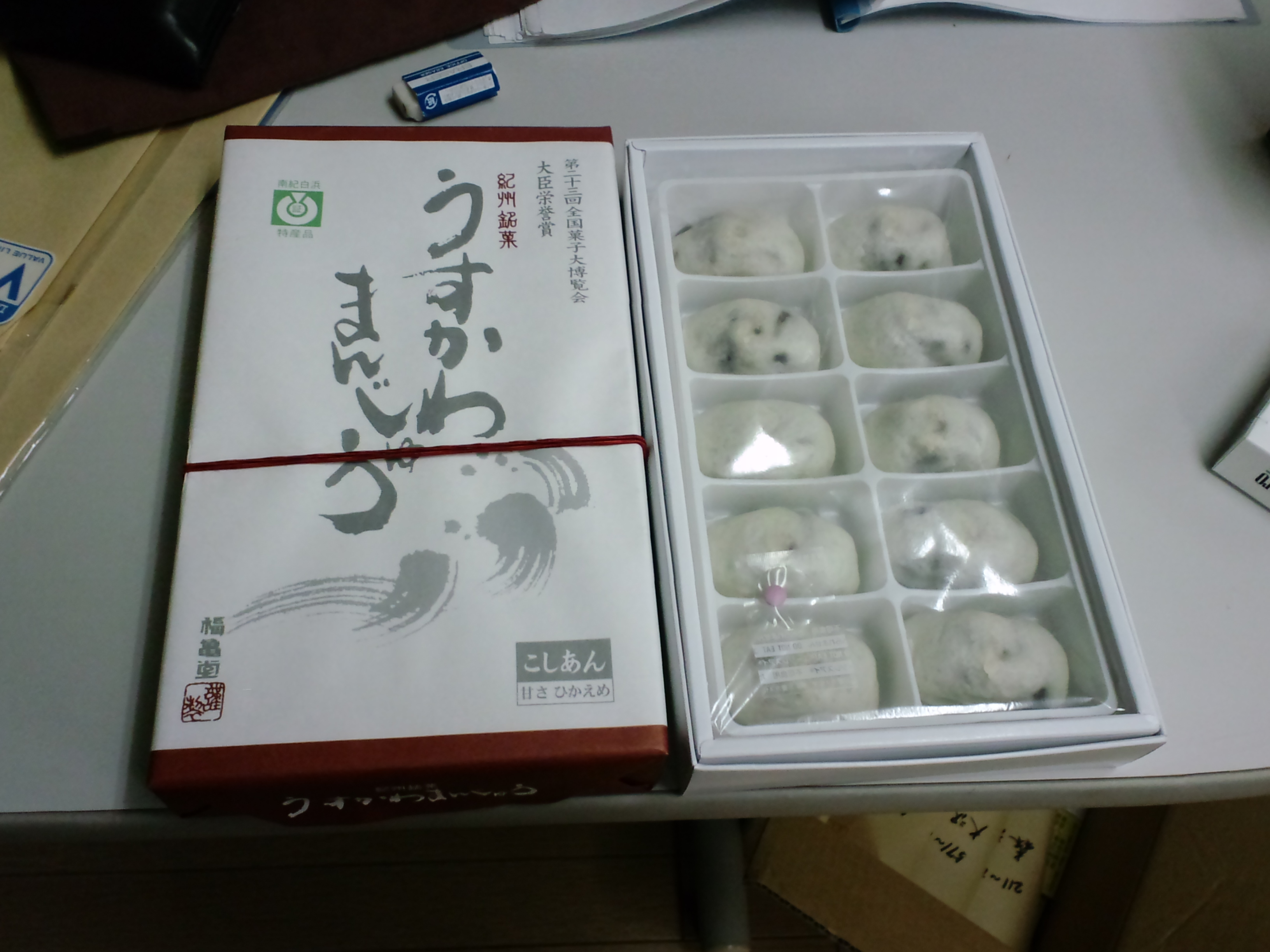 写真は差し入れに頂いたまんじゅうです。疲れた時には饅頭だ!